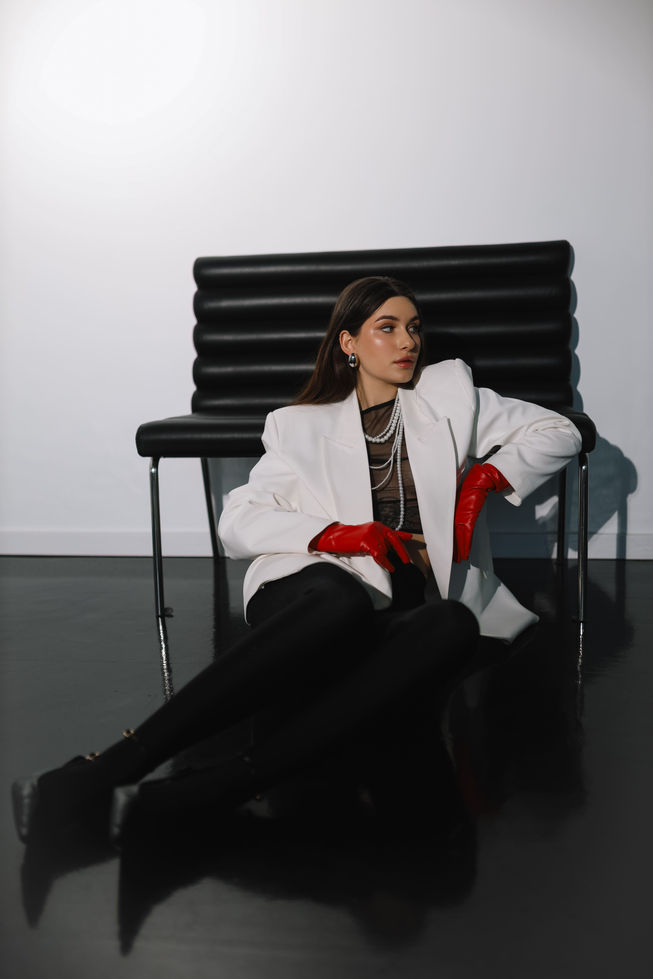 Ідеальний для стильних студійних зйомок. Контраст червоних рукавичок із білим піджаком і чорними лосинами додає кадрам динаміки й елегантності. Відчуйте себе вишукано.